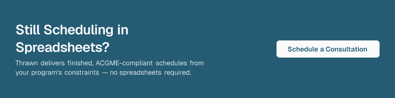 Programs at multiple top-20 academic health systems have already shifted to optimization-based scheduling. If your program is still building in spreadsheets, a consultation with Thrawn is worth exploring — the onboarding process starts with a conversation about your program's specific constraints, not a software demo.