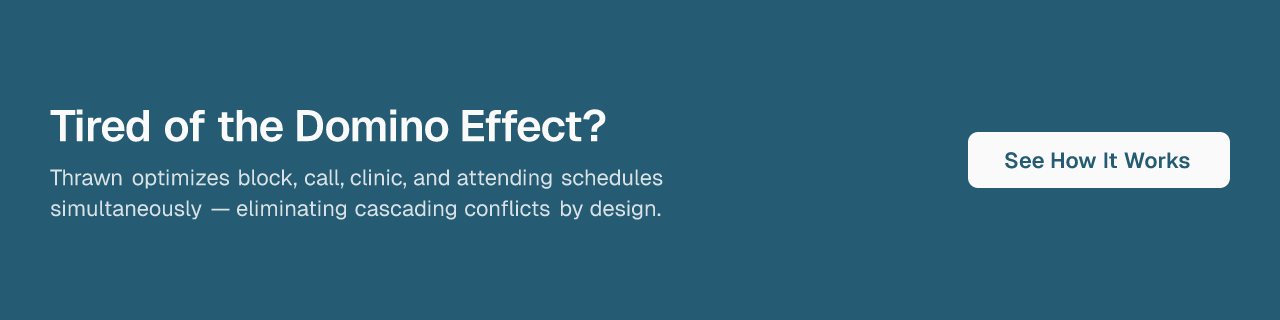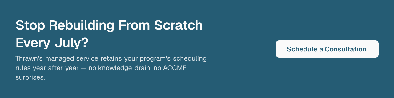 Thrawn's managed scheduling service handles the entire workflow from constraint gathering to finished schedules, with ACGME compliance built in as a generation constraint and mathematical fairness baked into every assignment. Programs at multiple top-20 academic health systems have already moved to this model. Thrawn offers a free scheduling consultation to see whether it fits your program — worth a conversation before your next chief class inherits the spreadsheet.