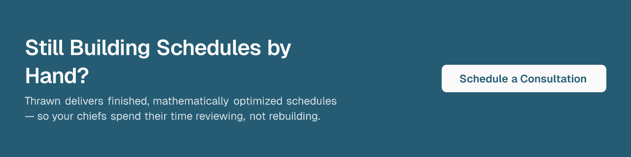 Because Thrawn retains that institutional knowledge within its specialist team, the incoming chief doesn't inherit a blank slate. The constraint library and scheduling logic persist across transitions. That's a structural advantage no self-serve tool can replicate.