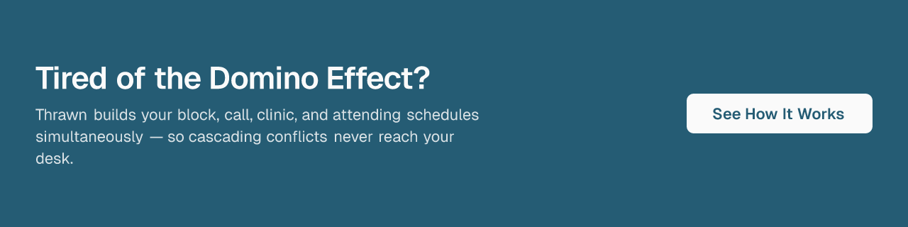 The domino effect persists. Block schedules, call schedules, clinic sessions, and attending coverage are deeply interdependent. Change one rotation assignment and you may need to rework call, adjust clinic coverage, and flag an attending conflict. Most self-serve tools manage each schedule type in a separate module, leaving the chief to manually trace and resolve the downstream effects. This cascading problem is one of the primary sources of scheduling burden identified in residency program research.