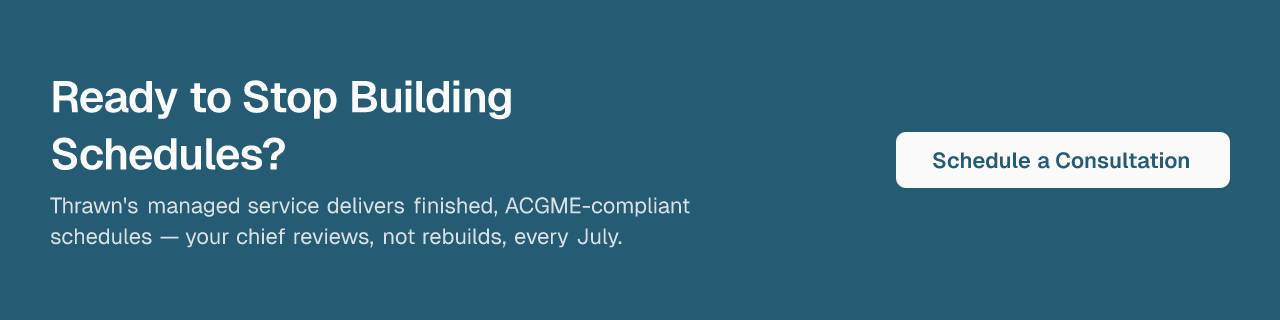 Thrawn's managed scheduling service handles the entire workflow: constraint gathering, schedule generation, ACGME compliance, cross-schedule coordination, and knowledge retention across chief transitions. As Dr. R. Kapoor, a Clinical Fellow in Neurocritical Care, put it: "Scheduling can be one of the most stressful and time-consuming parts of the role, but Thrawn made the entire process seamless. I would highly recommend their services to any program looking for a reliable and efficient way to build equitable schedules."