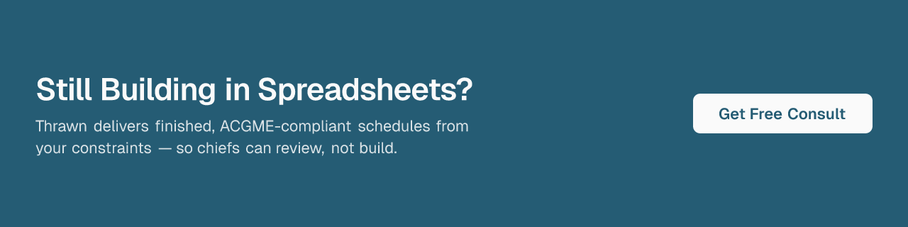 One underappreciated aspect of the managed service model: the scheduling knowledge is retained by Thrawn across chief resident transitions. The institutional rules, edge cases, and program-specific constraints don't walk out the door every July. The incoming chief class inherits a working system — not a spreadsheet and a learning curve.