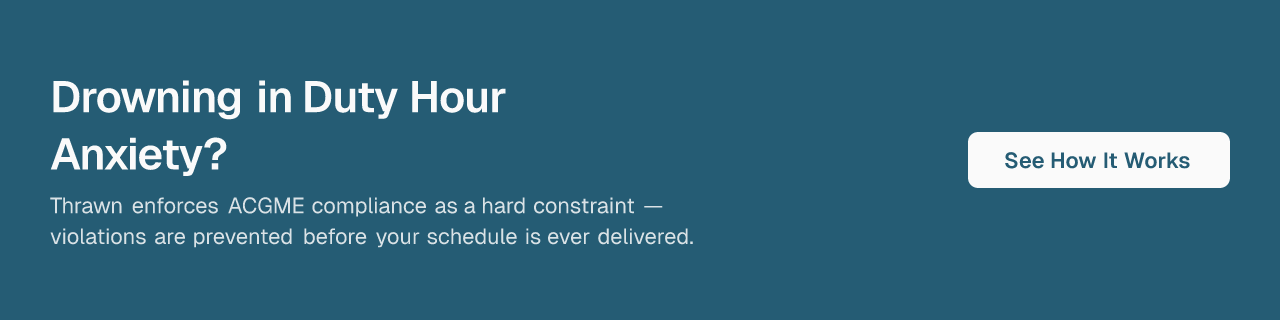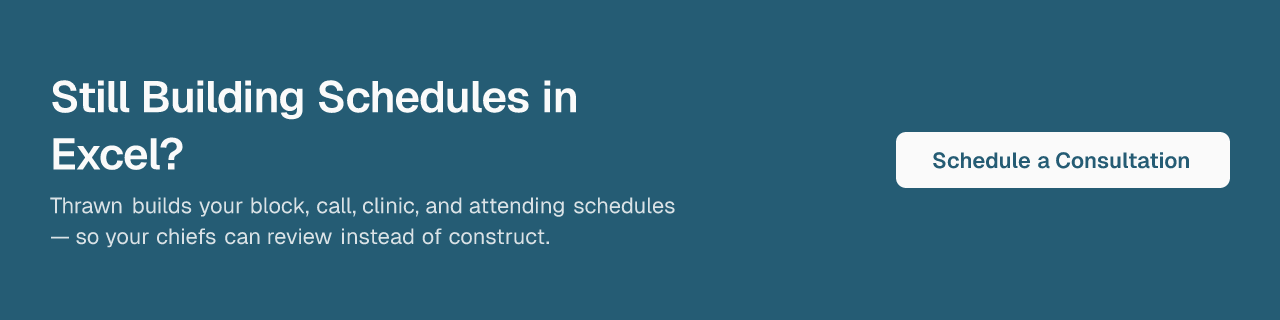 This is where Thrawn, a done-for-you managed scheduling service, is built for exactly this problem. Programs send their constraints to Thrawn — rotation requirements, call rules, resident preferences, ACGME duty hour limits — and receive finished schedules for review. Chief residents go from schedule builders to schedule reviewers.