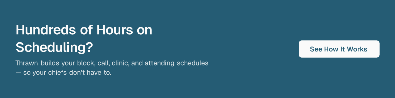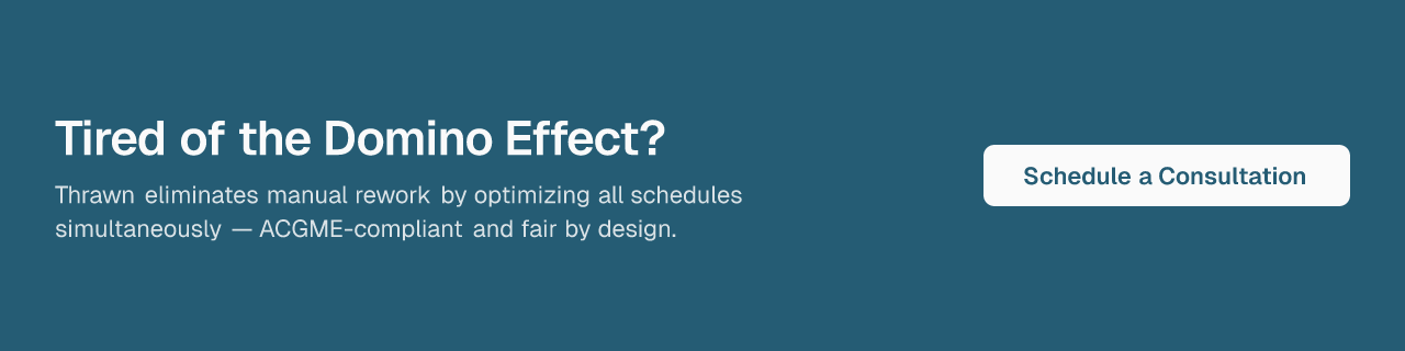 Thrawn's managed service handles the full scheduling workflow from constraints to finished schedules, with ACGME compliance built in as a generation constraint and mathematical fairness baked into every assignment distribution. Programs at multiple top-20 academic health systems have already moved to optimization-based scheduling. If your program is ready to explore what that looks like, a personalized consultation is available.