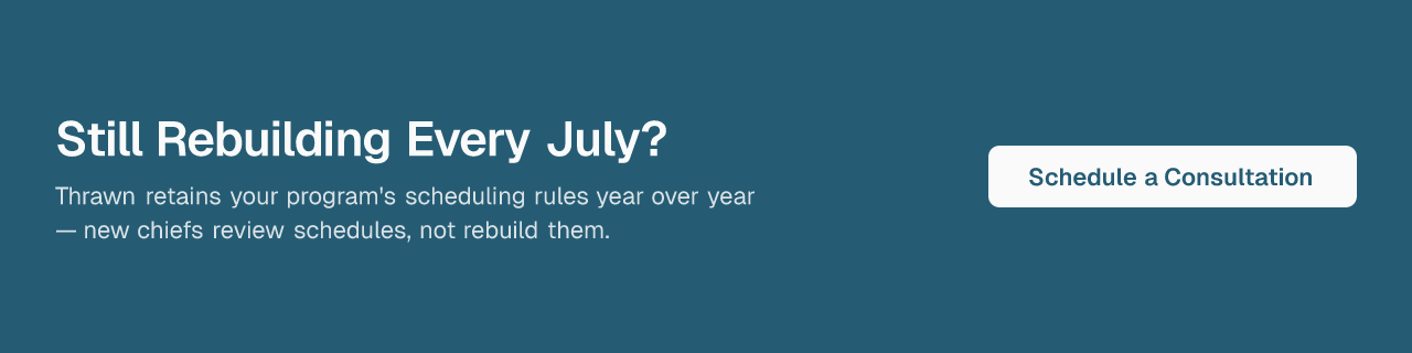 If your pre-visit audit reveals significant gaps, it may be worth exploring a different model. Thrawn's done-for-you managed service handles the entire scheduling workflow — from constraints to finished, ACGME-compliant schedules — so that you spend your time reviewing and leading, not building and repairing. A personalized consultation is the starting point, with pricing tailored to program size and needs.