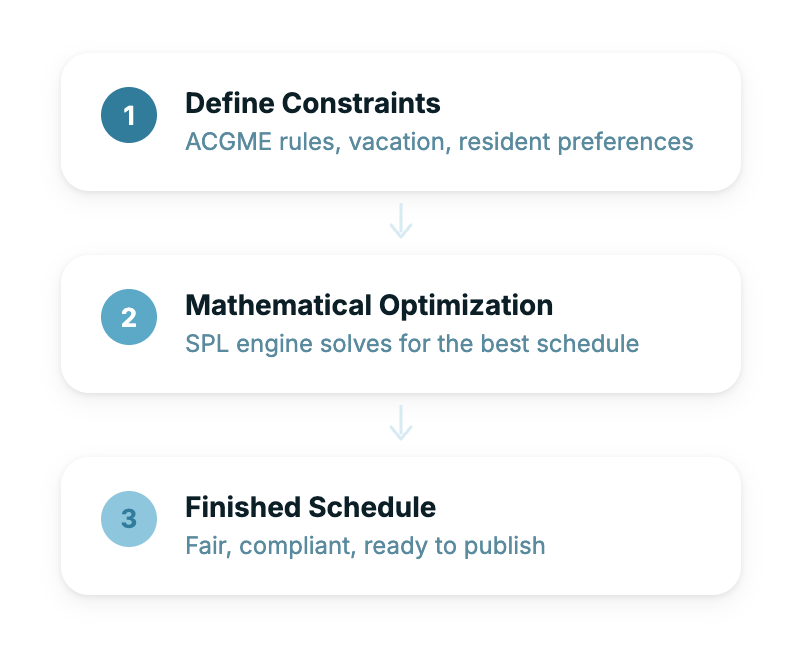Thrawn's managed service uses mathematical optimization to deliver automated physician scheduling that bakes ACGME duty hour rules into every schedule. Chiefs review finished schedules instead of building them.