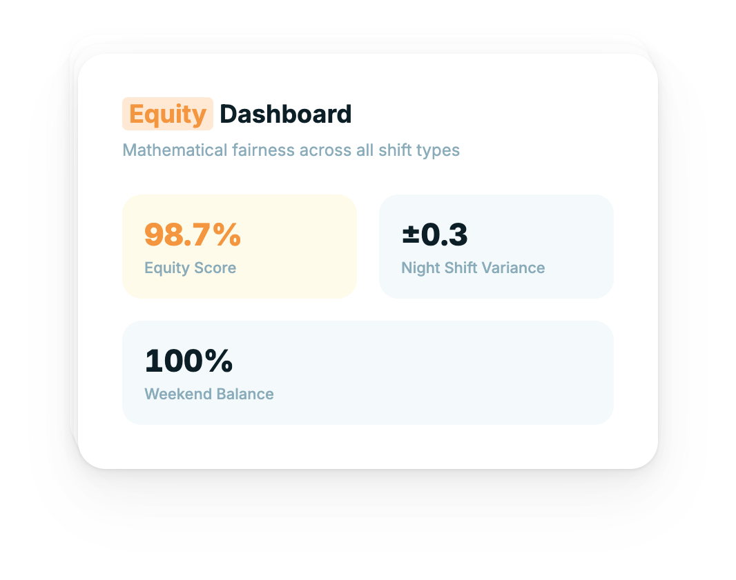 Thrawn's Scheduling Programming Language (SPL) treats shift equity as a hard mathematical constraint, not an afterthought. Nights, weekends, and holidays are distributed across all residents with provable, quantifiable balance — not approximation. See how this works for [chief residents managing call schedules](/uses/scheduling-for-chief-residents).